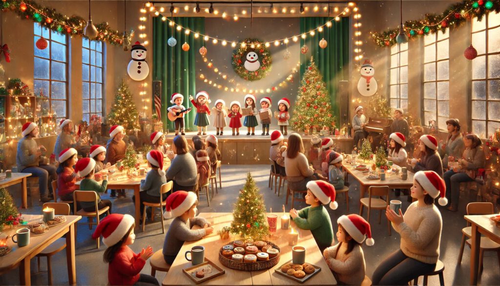 Am Mittwoch, den 11.12.2024, fand an unserer Schule die stimmungsvolle Weihnachtsfeier für die 5. Klassen statt. Die Feier wurde von den Schülern der Klasse 8c im Rahmen des Sozialkundeunterrichts unter der Leitung von Frau Beck mit viel Engagement vorbereitet: Plätzchen wurden gebacken, Tische festlich gedeckt und Kaffee sowie Tee für die Eltern gekocht.